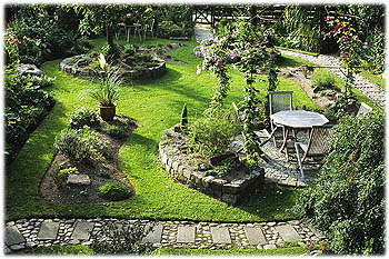 tørrer ud. ![]() Sol og sommer I en del af forhaven samt i bede rundt om huset er anlagt stenbede. Store sten er hjemført fra nærliggende marker og spændende interiører er opbygget i hævede bede. Dværgstedsegrønne danner sammen de store sten selve arkitekturen i bedene, hvorimellem der så en sat alpine planter. I randbede i forhaven omkring græsplænen med hævede stenbede findes stauder og roser integreret med smukke buske som baggrund. |