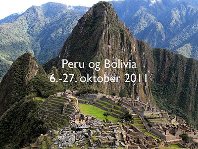 Peru og Bolivia 2011 En flot og særdeles veltilrettelagt tur med dansk rejseselskab gjorde denne rejse til en uforglemmelig oplevelse. Et af højdepunkter var besøget i Machu Picchu i Peru, men Titicaca-søen var ligeledes interessant samt turen over bjergene til La Paz. Afslutningen på turen blev ikke helt som forventet, idet jeg fik højdesyge, og vi måtte flyves til en lavere højde, hvilket var ved bredden af en af Amazonflodens bifloder. Her blev jeg frisk igen, og der var masser at opleve i tropeskoven. |