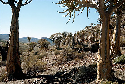 Sydafrika 2004 Kort tid efter landing i Cape Town tog vi gondolliften op på Taffelbjerget. Det var en dejlig start på turen. De følgende 14 dage oplevede vi et blomsterflor, som vi ikke har set mage. Betagende smukt med forskellige biotoper fra busksteppe med mange sukkulenter til blomsterenge og marker i de stærkeste farver. Nationalblomsten Protea cynaroides var helt utrolig og ikke at forglemme en skov af fortidstræer, Aloe dichotoma. |